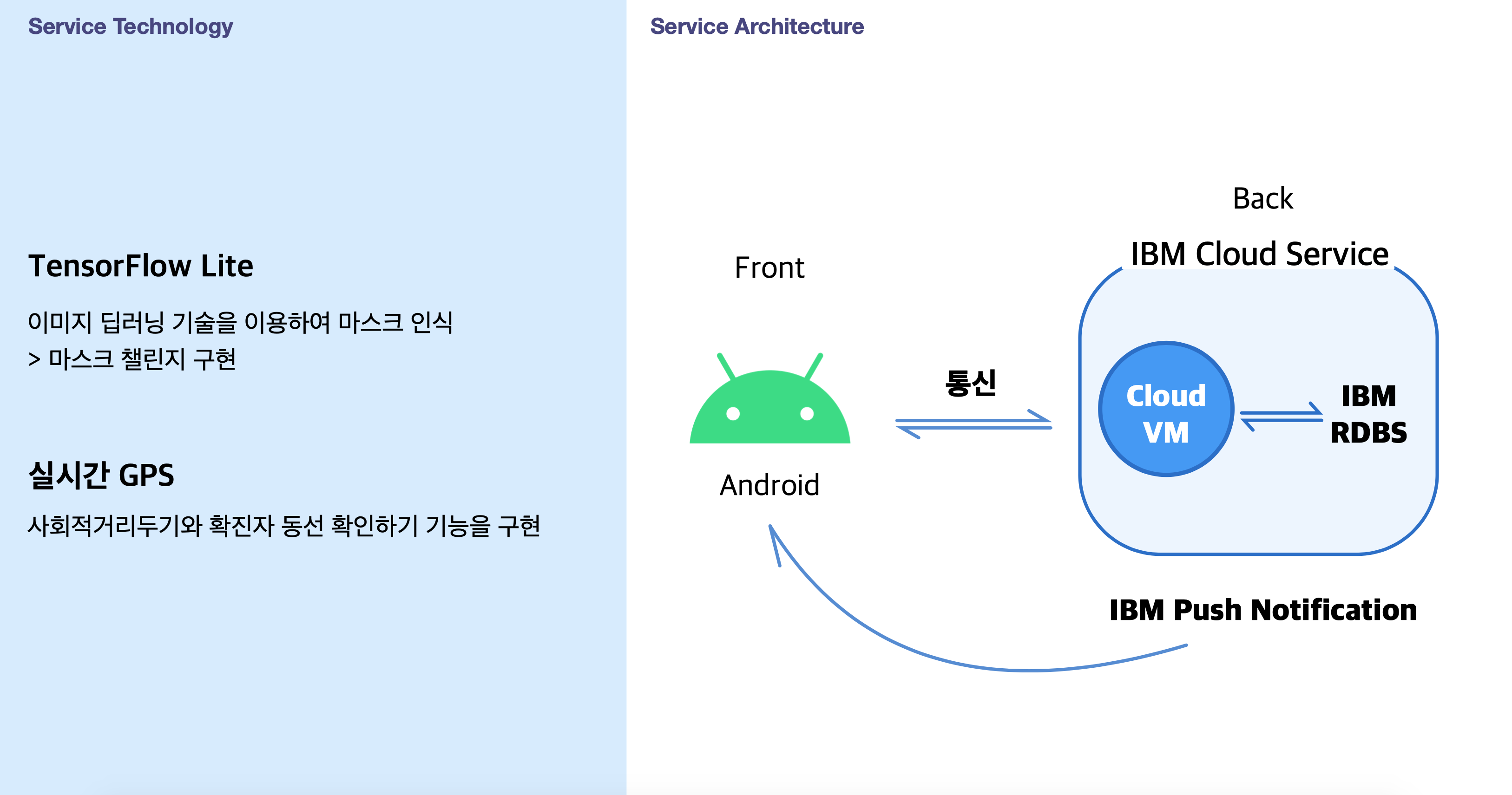 또한 IBM 해커톤이기 때문에 서버를 IBM 클라우드 서비스를 사용하였습니다.